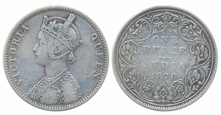Victoria Empress, Silver Rupee, 1877, Obv: Crowned Bust of Victoria facing left, Legend “VICTORIA EMPRESS”, Rev: Legend “ONE RUPEE INDIA” date with in wreath. Very fine. Certified, Authenticated and packed in Temper Proof Coin Card. You are saving Rs. 100/- on this purchase.