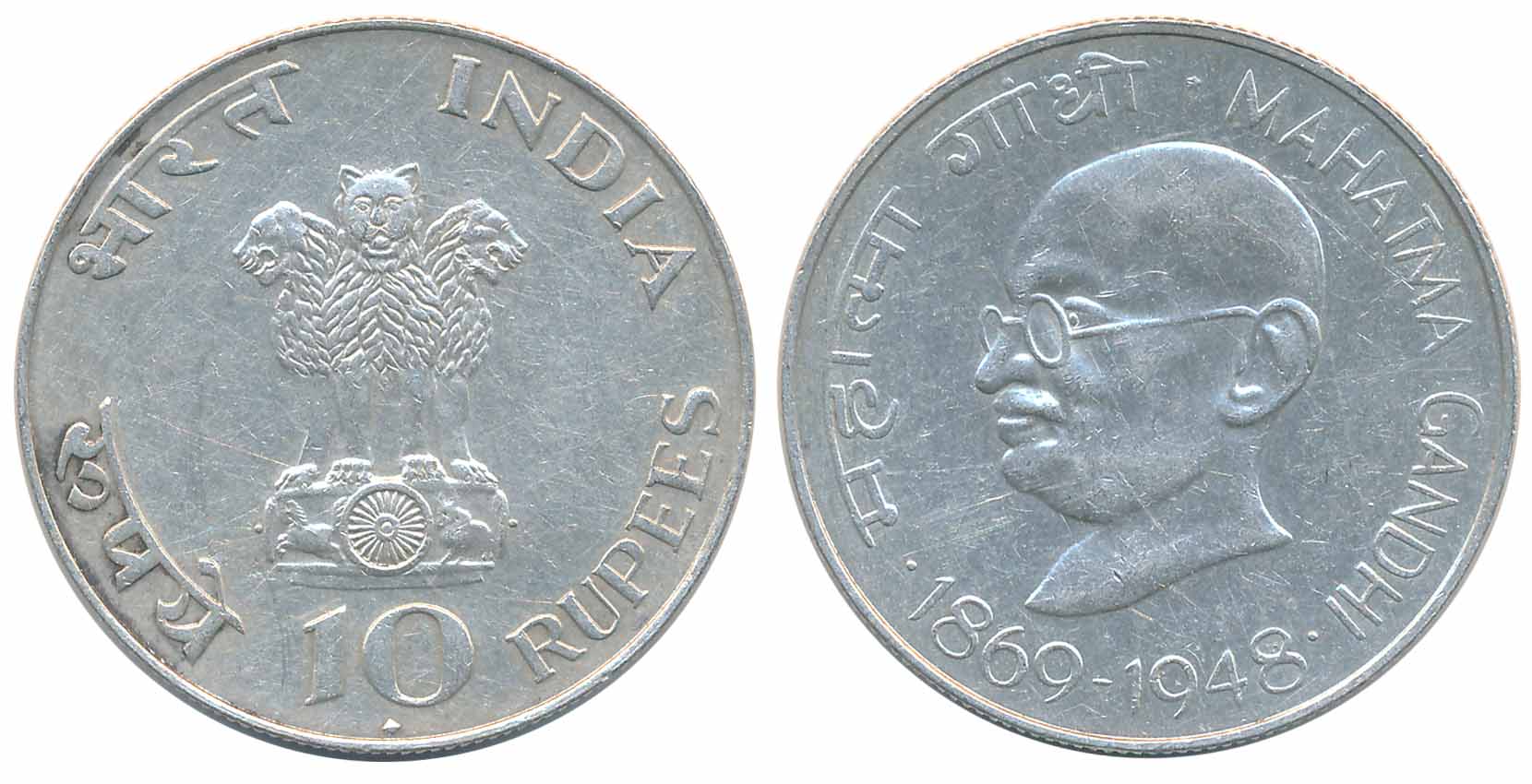 1969, 10 Rupees, Silver, “Centenial-Mahatma Gandhi’s Birth”, Bombay Mint Obv: Ashoka Lion Pedestal, Rev: Portrait of Mahatma Gandhi facing left date below (KM# 185). Uncirculated. You are saving Rs. 100/- on this purchase.