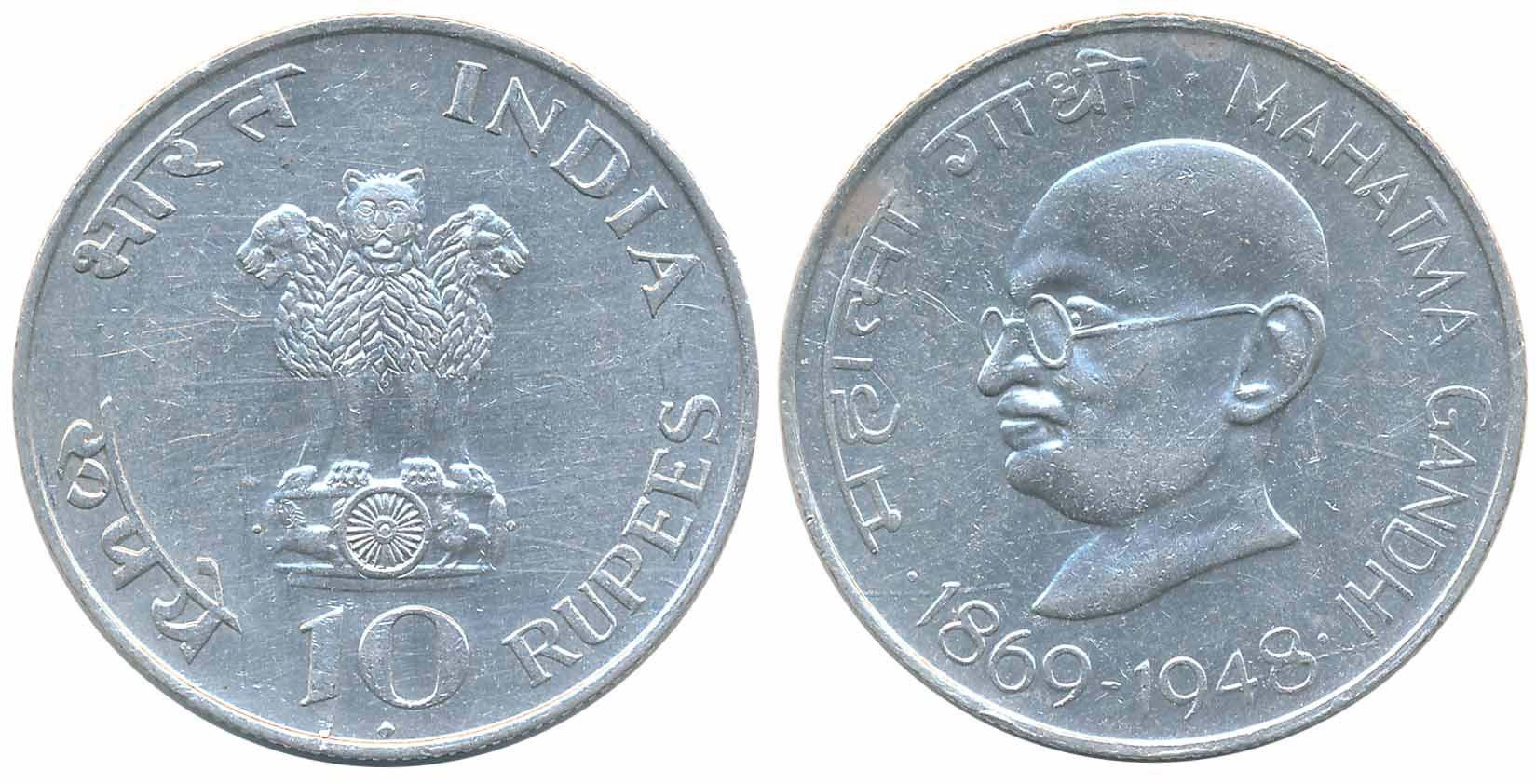 1969, 10 Rupees, Silver, “Centenial-Mahatma Gandhi’s Birth”, Bombay Mint Obv: Ashoka Lion Pedestal, Rev: Portrait of Mahatma Gandhi facing left date below (KM# 185). Uncirculated. You are saving Rs. 100/- on this purchase.