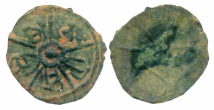 Maurya- Sunga Period, Kausambi region, Uninscribed, Cast Copper, 4.03g, Obv: Elephant facing left in front of Indrawaja, Nandipada and Swastika on top, Rev: Railed tree, three arched hill and hollow cross (Piper# 196). Very fine.