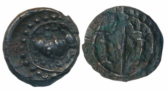 Vishnukundin, Andhra Region, Copper Base Alloy, 2.74g, Obv: Lion facing right front Srivatsa, Rev: Conch shell between two tridents. Very fine to very fine+.