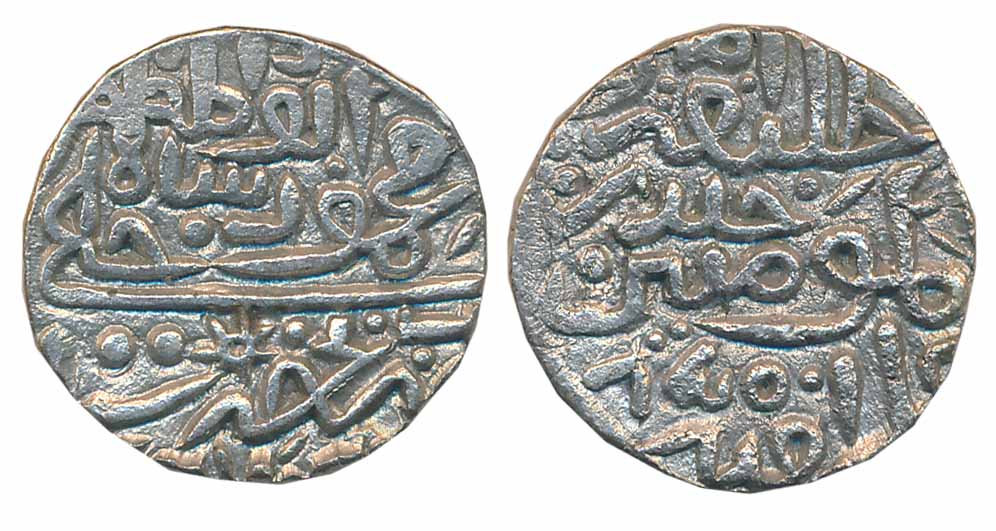 Ghiyath bin Tughluq, Billion 4 Gani, 3.59g, AH 727, Obv: al sultan al ghazi ghiyath al dunya wa’l din, Rev: abu’l muzaffar Tughluq shah al sultan (G&G# D311). Very fine.