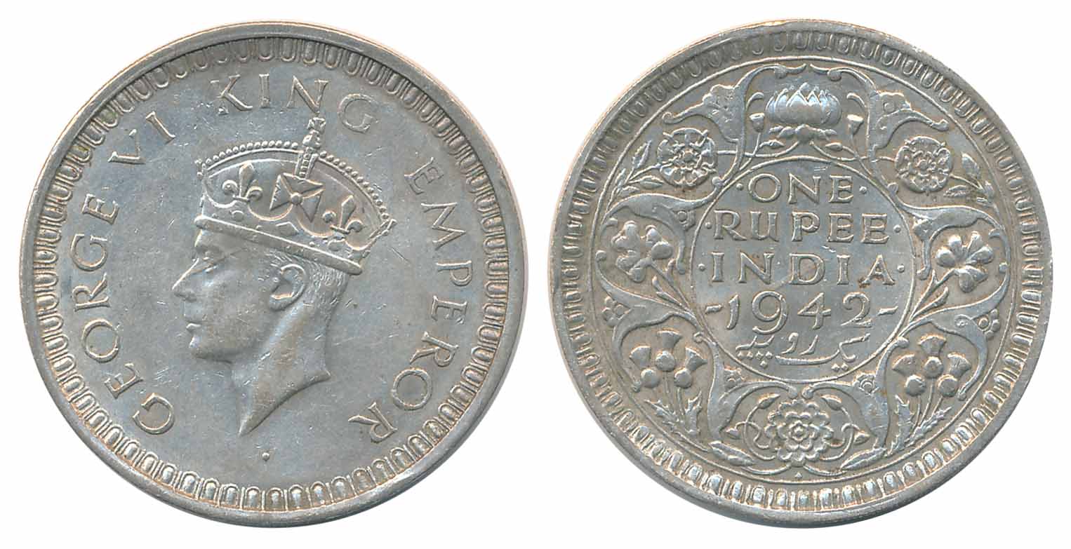 George VI, Silver Rupee, 1942, Obv: Crowned head to left, Rev: Denomination & Date within circle, wreath surrounds, Very Fine. Certified, Authenticated and packed in Temper Proof Coin Card. You are saving Rs.50/- on this purchase.
