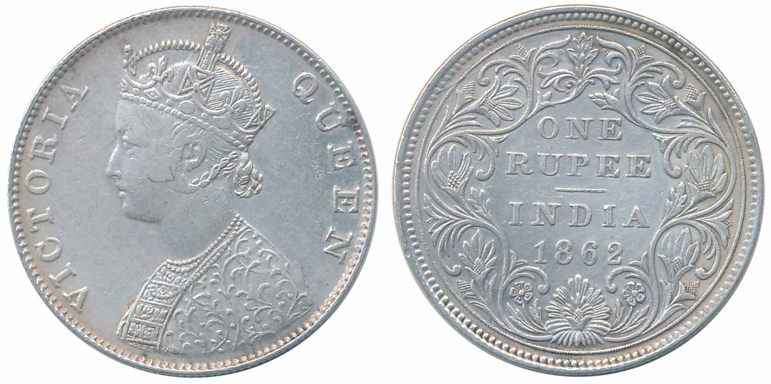 Victoria Queen, Silver Rupees,1862, Obv: Crowned Bust of Victoria facing left, Rev: Legend “ONE RUPEE INDIA” date with in wreath. Very fine. Certified, Authenticated and packed in Temper Proof Coin Card. You are saving Rs. 100/- on this purchase.
