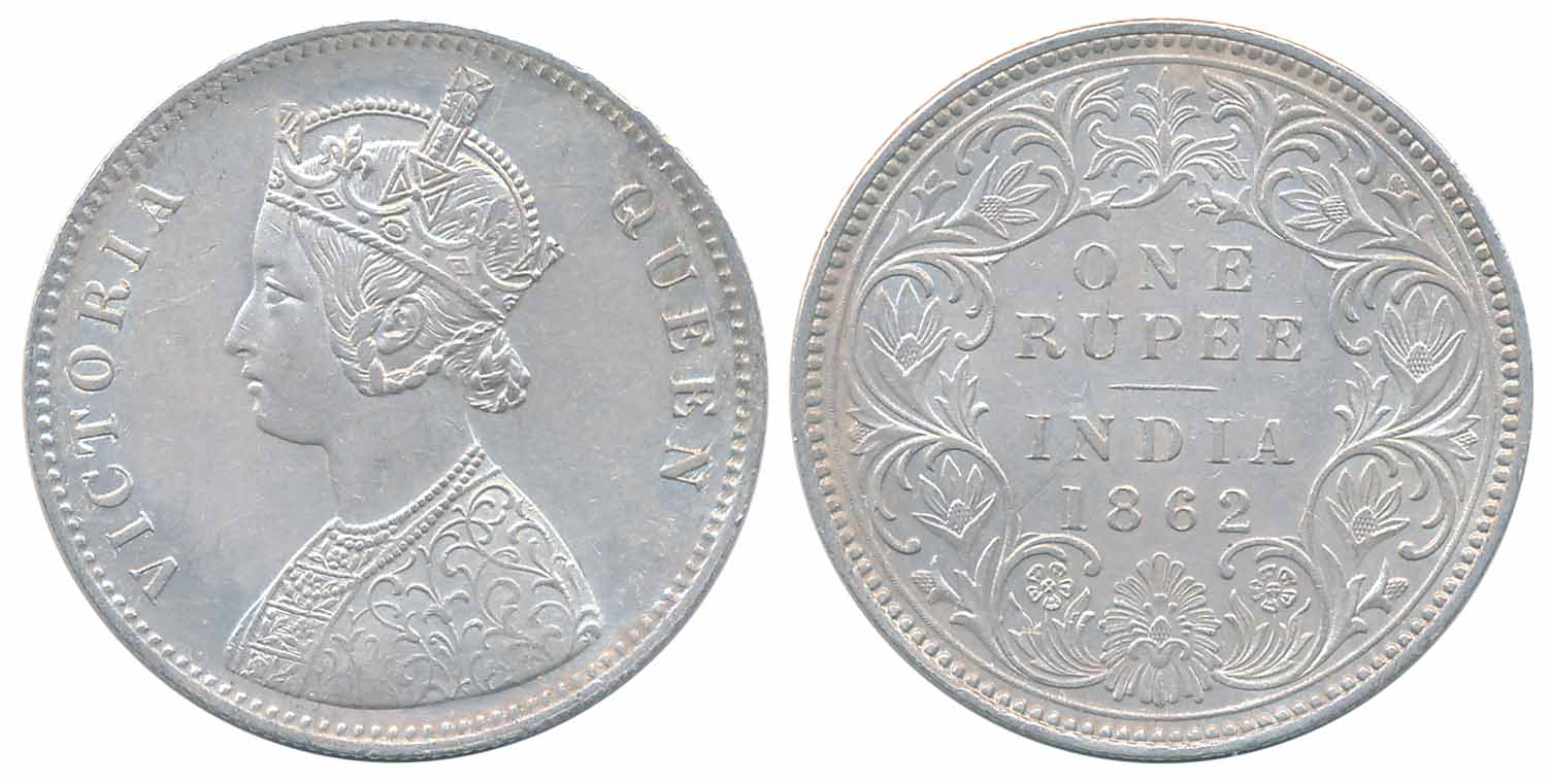 Victoria Queen, Silver Rupees,1862, Obv: Crowned Bust of Victoria facing left, Rev: Legend “ONE RUPEE INDIA” date with in wreath. Very fine. Certified, Authenticated and packed in Temper Proof Coin Card. You are saving Rs. 100/- on this purchase.