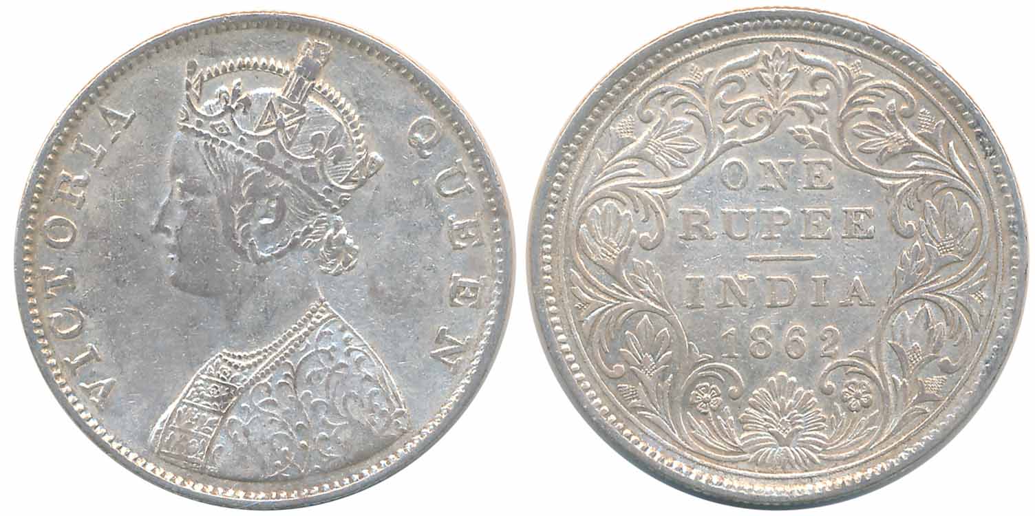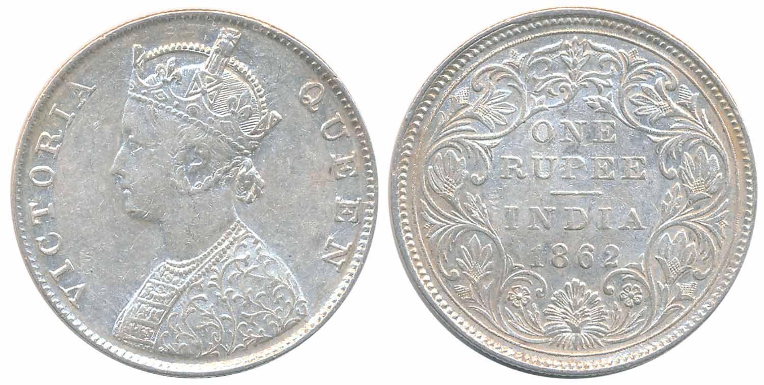 Victoria Queen, Silver Rupees,1862, Obv: Crowned Bust of Victoria facing left, Rev: Legend “ONE RUPEE INDIA” date with in wreath. Very fine. Certified, Authenticated and packed in Temper Proof Coin Card. You are saving Rs. 100/- on this purchase.
