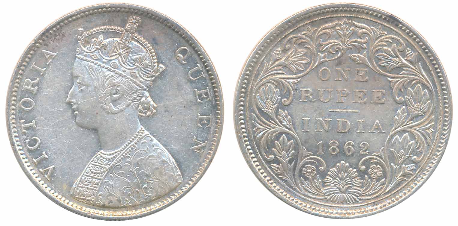 Victoria Queen, Silver Rupees,1862, Obv: Crowned Bust of Victoria facing left, Rev: Legend “ONE RUPEE INDIA” date with in wreath. Very fine. Certified, Authenticated and packed in Temper Proof Coin Card. You are saving Rs. 100/- on this purchase.
