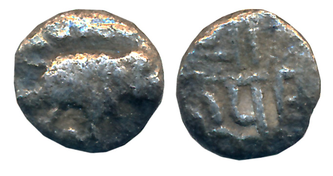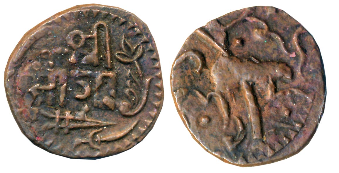 Vima Kadphises, Copper, 17.06g, Obv: King wearing tunic, trousers & elongated diademed crowned, offering an alter, Greek legend around, Rev: Lord Shiva holding Trident, standing facing front a Bull (Piper# 1186). Very fine+.