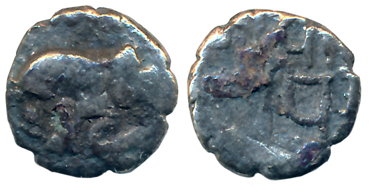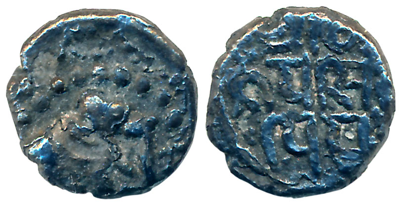 Medieval Gujarat, Solankis of Patan, Jayasimha Siddharaja, Silver Mashas, 0.20g, Obv: Elephant walking to right in dotted border, Rev: Devnagari legend in three lines (John Deyell # 163) Very fine.