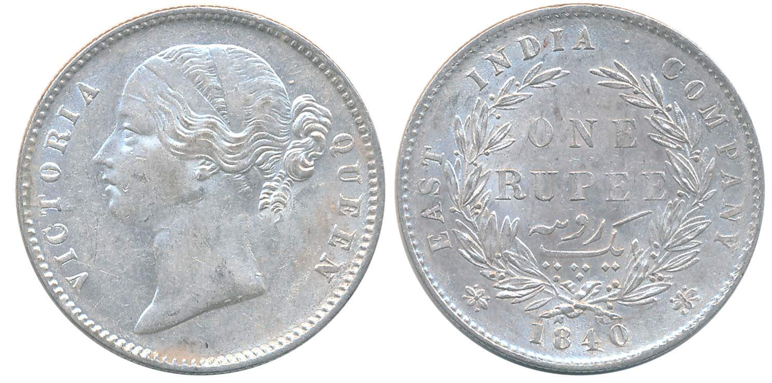 Victoria Queen, Silver Rupee, 1840, Divided Legend, Obv: Bust of Victoria Queen facing left Divided Legend “VICTORIA QUEEN” above, Rev: Value “ONE RUPEE” with in wreath date 1840 below. Legend “EAST INDIA COMPANY” above, Very fine. You are saving Rs. 150/- on this purchase.