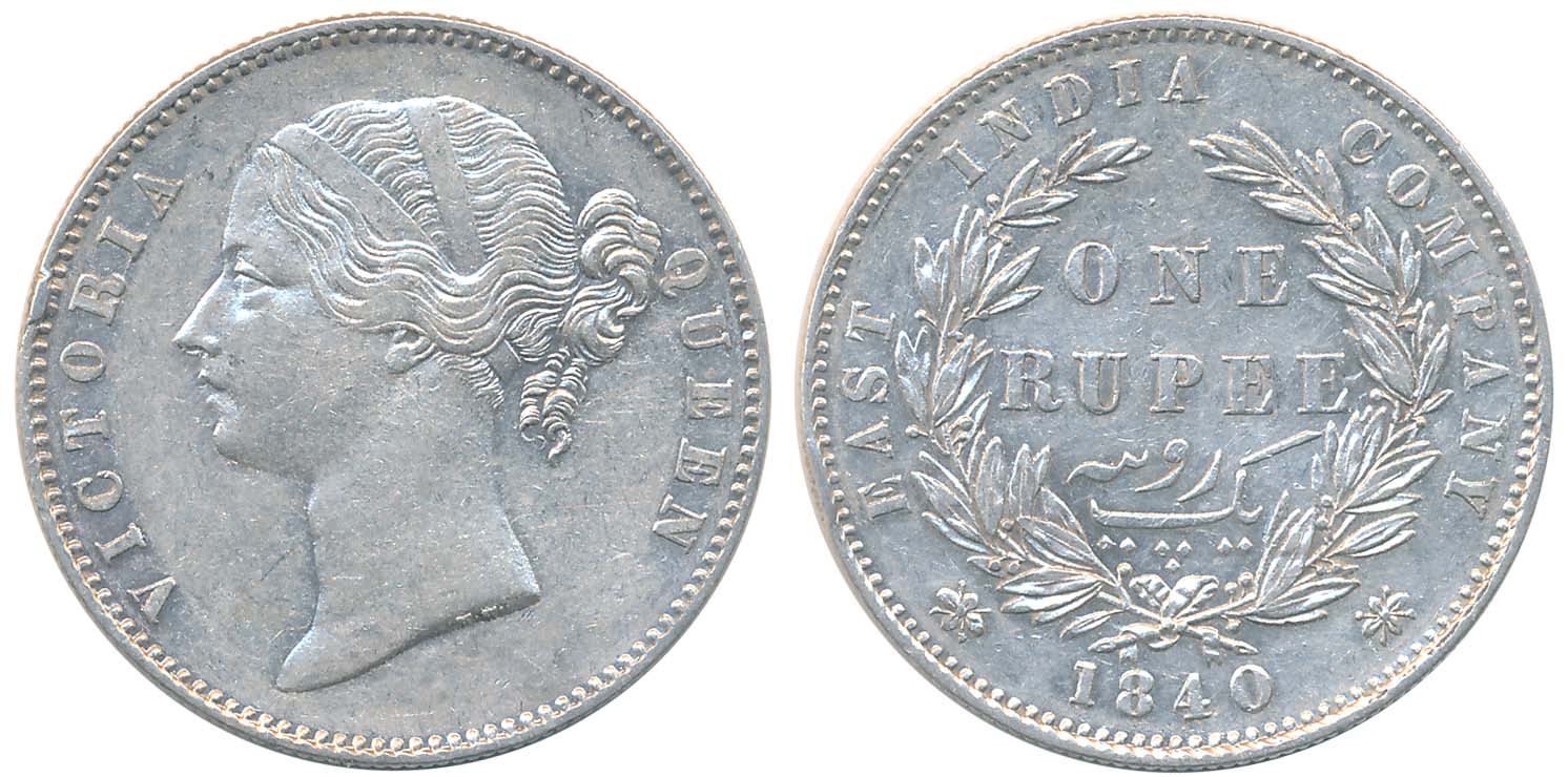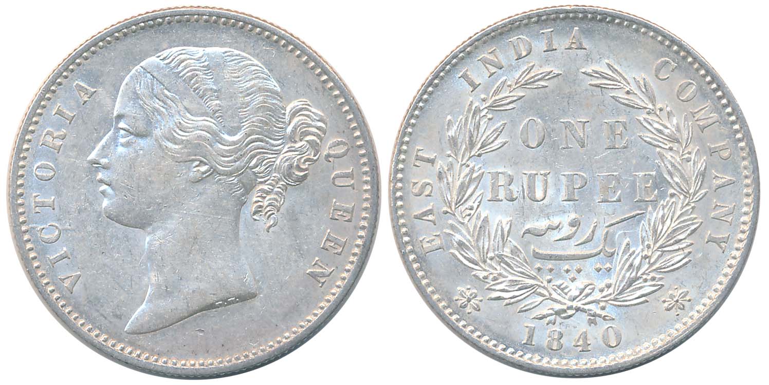 Victoria Queen, Silver Rupee, 1840, Divided Legend, Obv: Bust of Victoria Queen facing left Divided Legend “VICTORIA QUEEN” above, Rev: Value “ONE RUPEE” with in wreath date 1840 below. Legend “EAST INDIA COMPANY” above, Very fine. You are saving Rs. 150/- on this purchase.