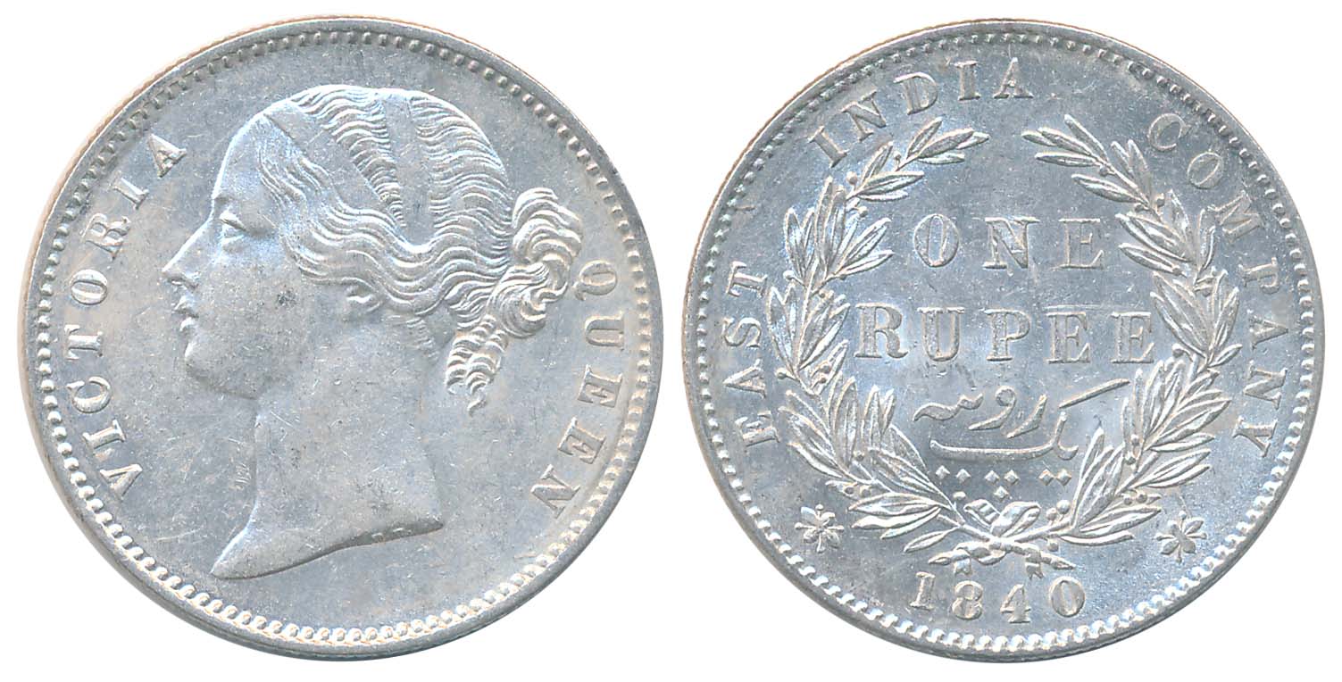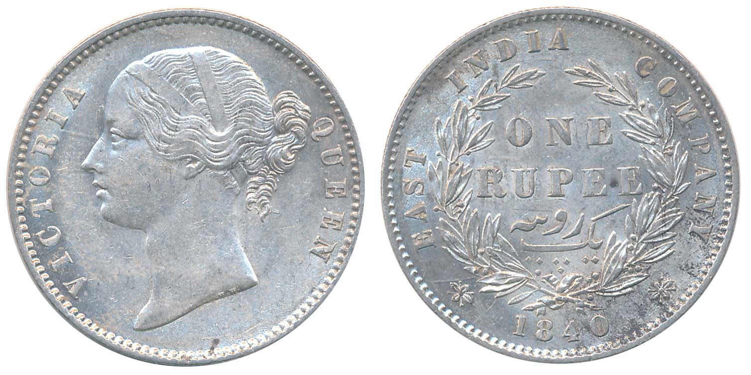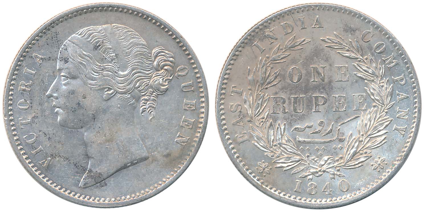 Victoria Queen, Silver Rupee, 1840, Divided Legend, Obv: Bust of Victoria Queen facing left Divided Legend “VICTORIA QUEEN” above, Rev: Value “ONE RUPEE” with in wreath date 1840 below. Legend “EAST INDIA COMPANY” above, Very fine. You are saving Rs. 150/- on this purchase.