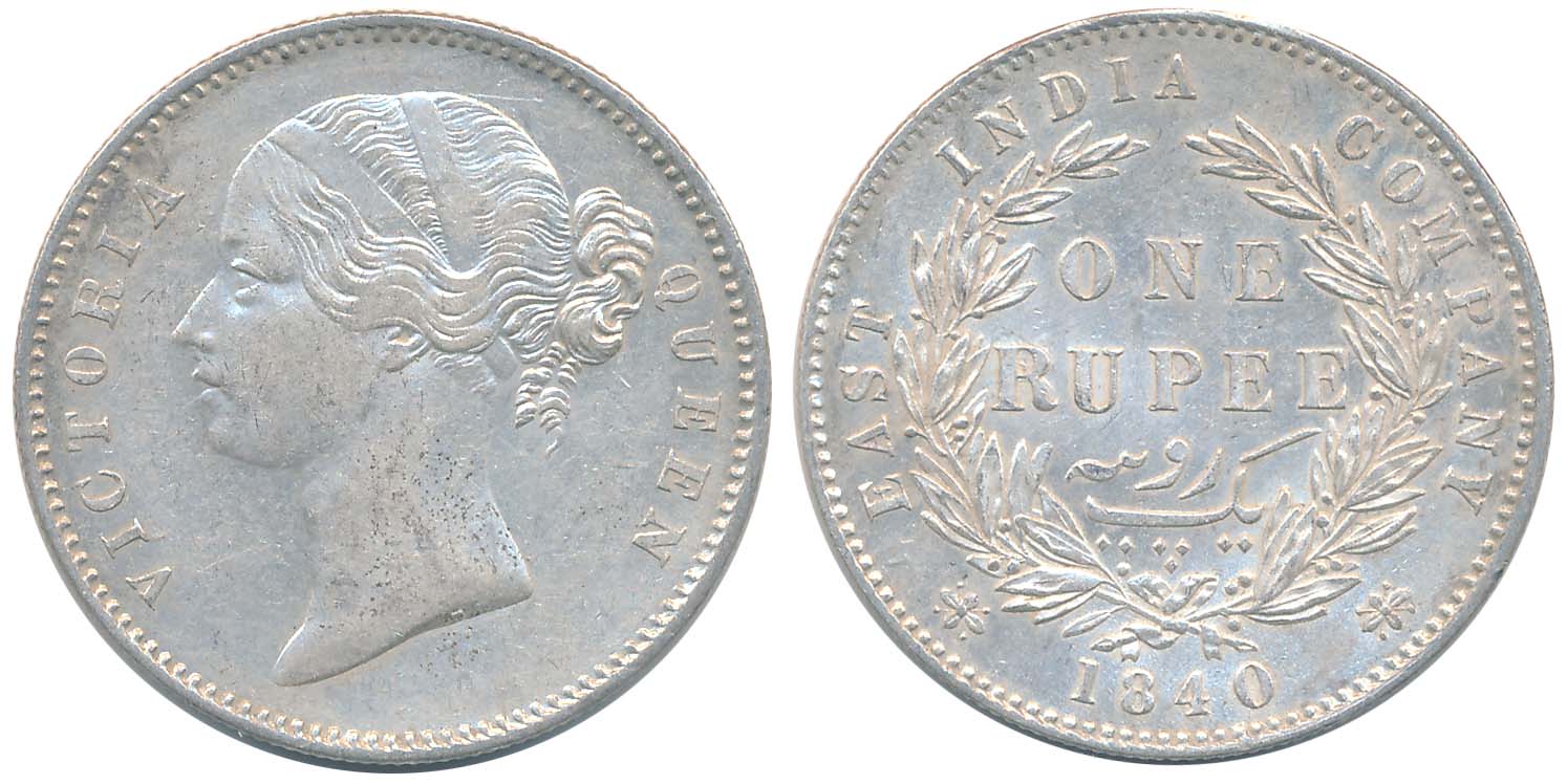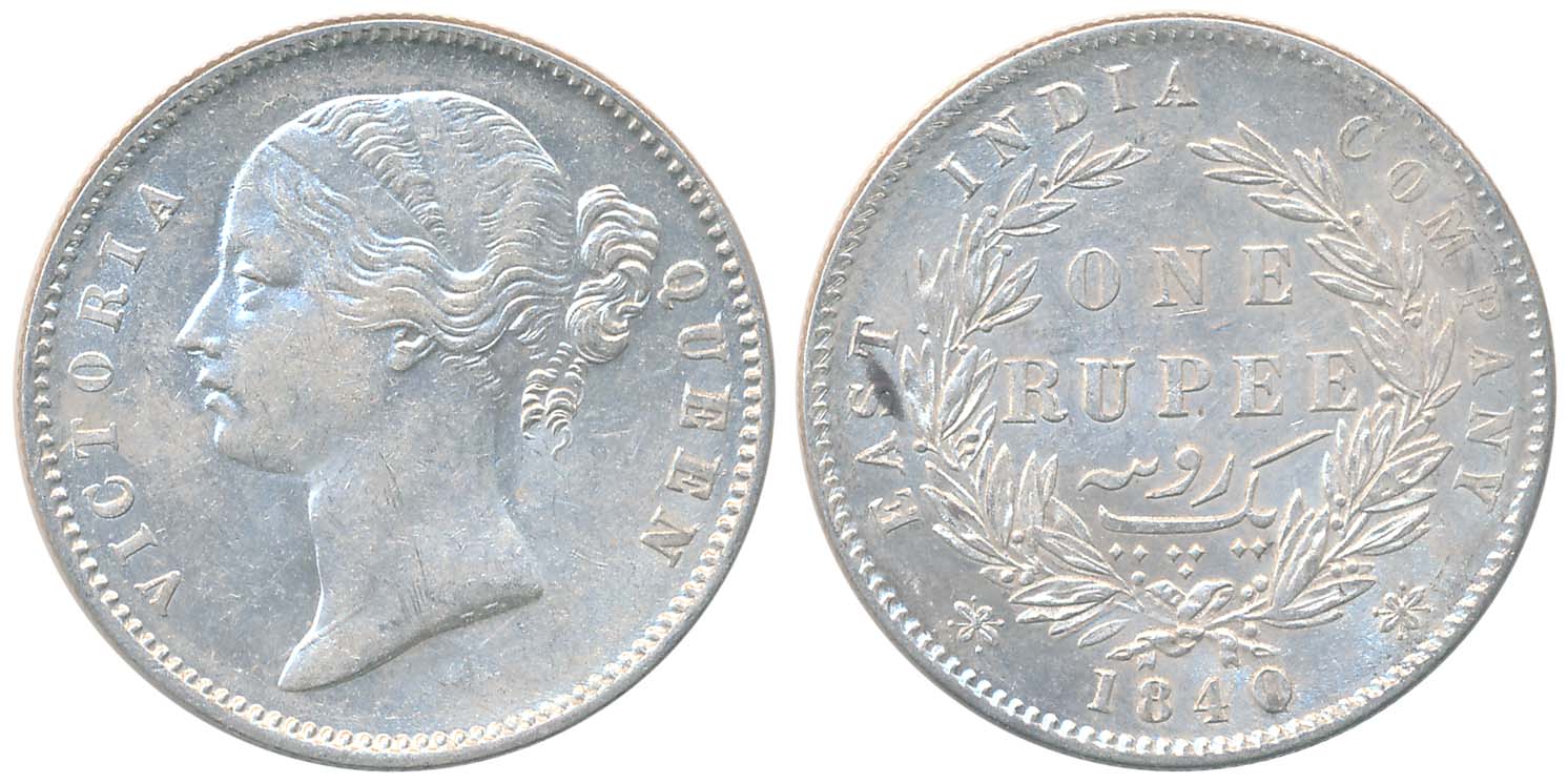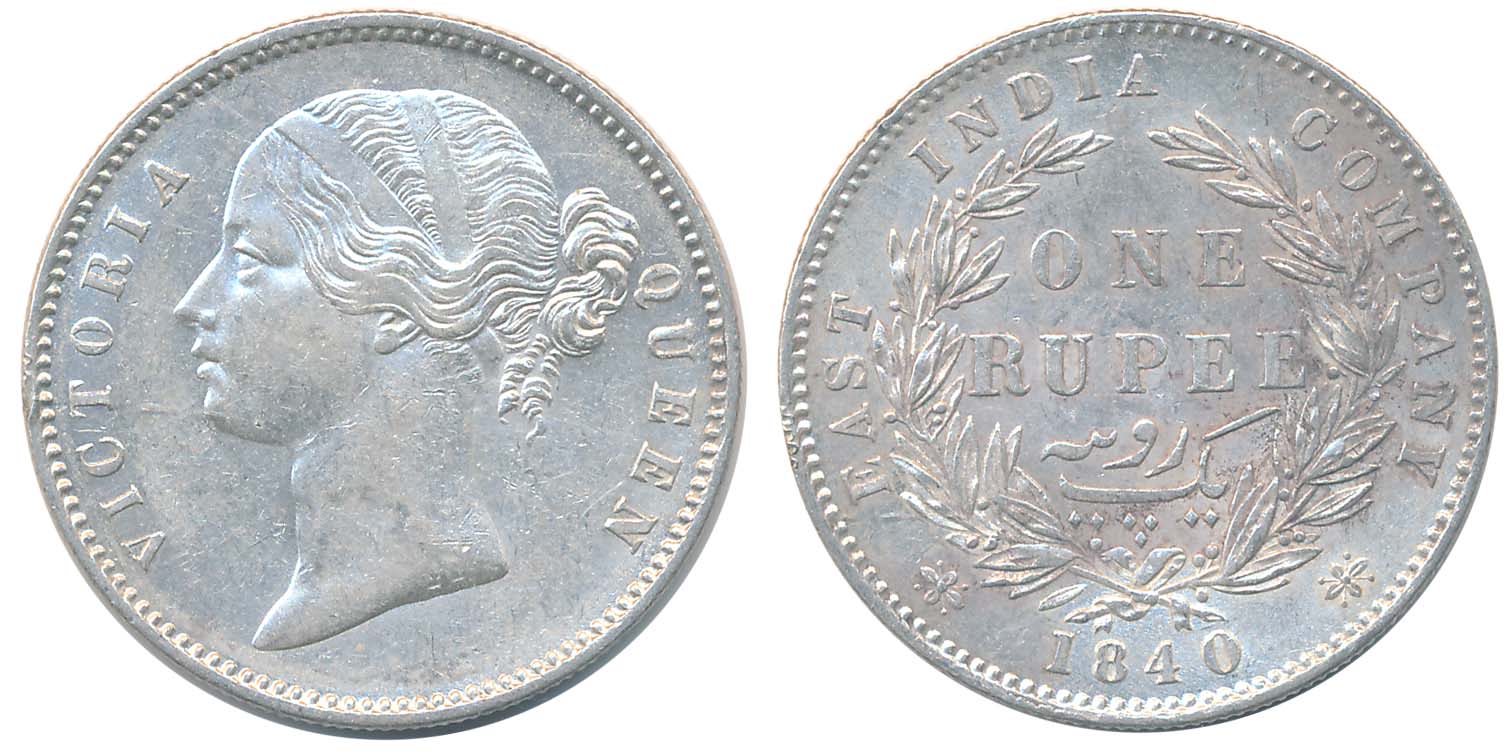 Victoria Queen, Silver Rupee, 1840, Divided Legend, Obv: Bust of Victoria Queen facing left Divided Legend “VICTORIA QUEEN” above, Rev: Value “ONE RUPEE” with in wreath date 1840 below. Legend “EAST INDIA COMPANY” above, Very fine. You are saving Rs. 150/- on this purchase.