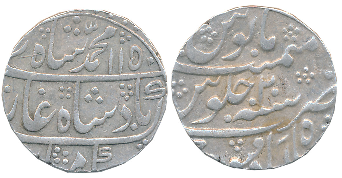 Farrukhsiyar, Silver Rupee, 11.32g, “Broad” flan, Itawa Mint, AH 1130/ RY 7, complete Mint name on bottom of reverse (KM# 377.34). About extremely fine.