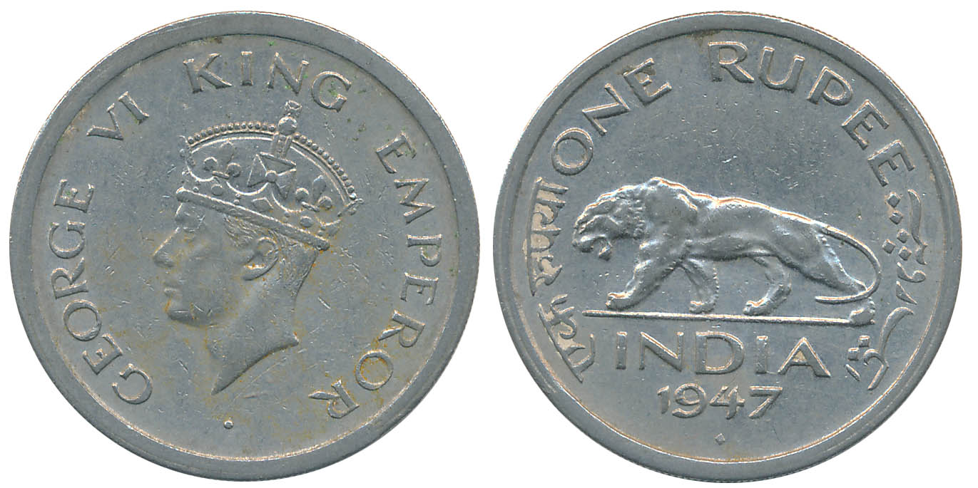 George VI, Nickle One Rupee, 1947, Obv: Crowned head to left, Rev: Indian Tiger, Date below (KM# 559). Very Fine. Certified, Authenticated and packed in Temper Proof Coin Card.