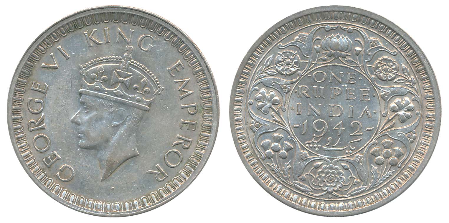 George VI, Silver Rupee, 1945, Obv: Crowned head to left, Rev: Denomination & Date within circle, wreath surrounds, Very Fine. Certified, Authenticated and packed in Temper Proof Coin Card. You are saving Rs.50/- on this purchase.