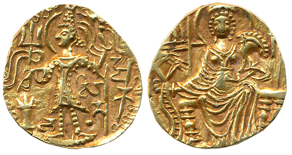 Vasudeva II, Gold Dinar, 7.68g, “Saka “type, Obv: Nimbate king wearing long coat, leggings and a crown with ribbons, holding a standard and offering sacrifice at an altar, Trident-standard with banners in the backdrop, Brahmi legend Vasu to the right, Brahmi letter “Ga” under the arm, “Vi” between the feet and Bha to the right of the altar, Rev: Nimbate goddess on high-backed throne, holding cornucopia and noose; crude Bactrian legend ‘Ardokhsho’ to right (Goebl 574). Extremely fine.