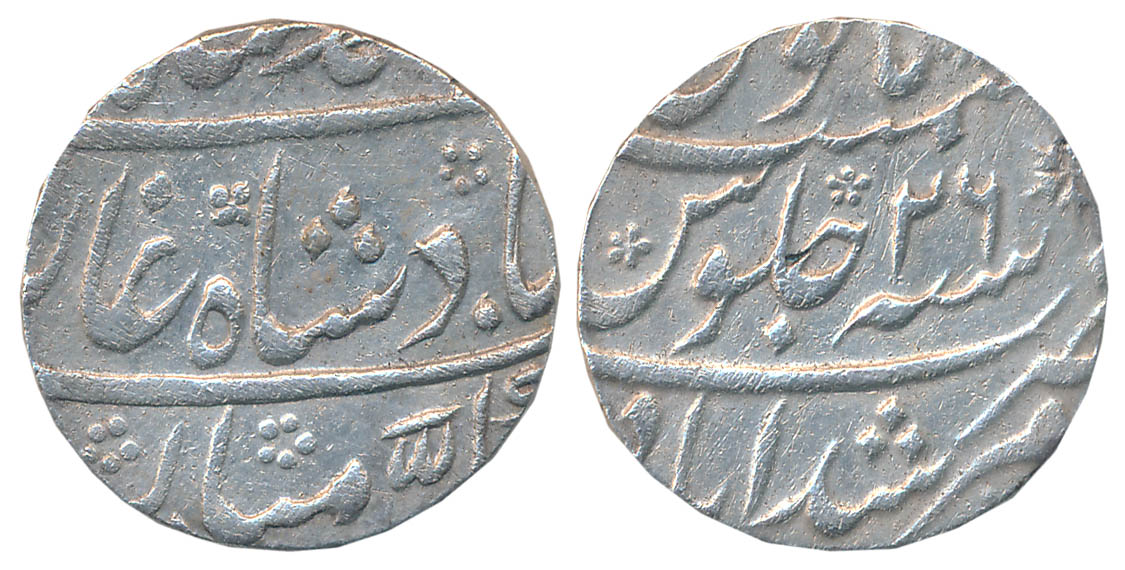 Muhammad Shah, Silver Rupee, 11.53g, Murshidabad Mint, AH 11XX/ RY 14 (KM# 436.46). Complete Mint name of bottom of reverse. Very fine.