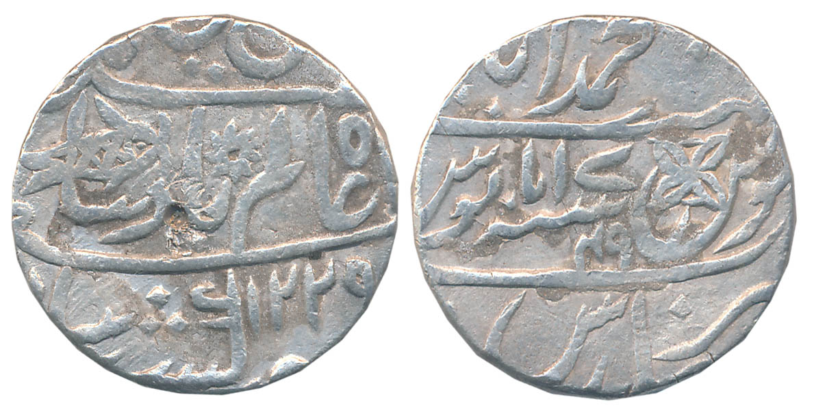 Muhammad Shah, Silver Rupee, 11.56g, Murshidabad Mint, RY 26 (KM# 436.46). Complete Mint name of bottom of reverse. Very fine+.