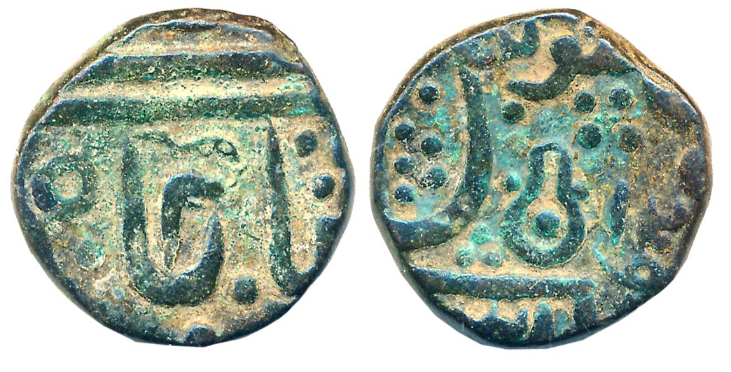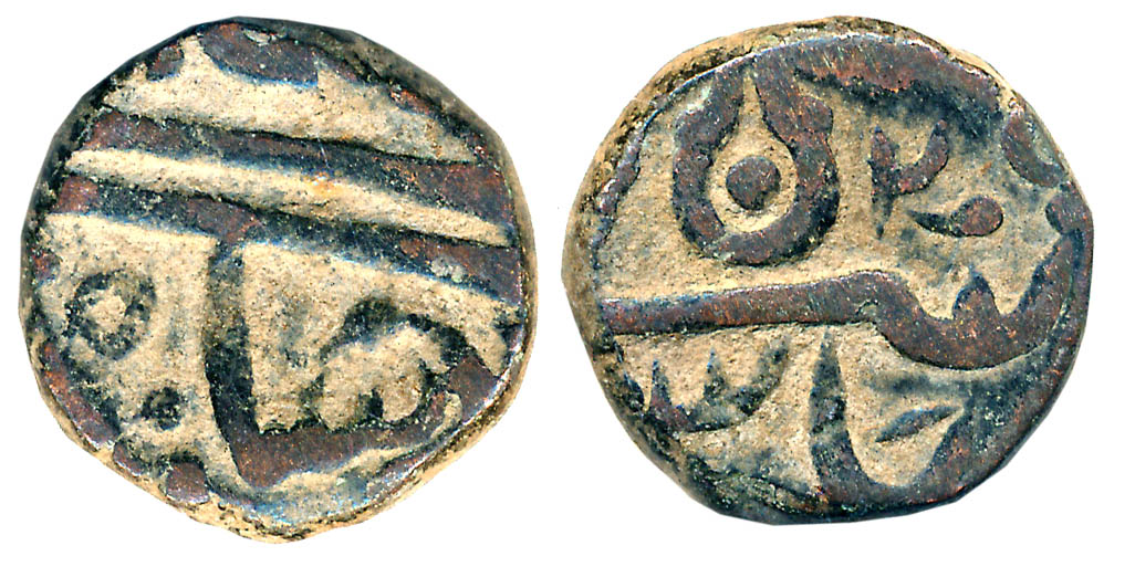 Indore, Copper, 11.30g, in the name of Shah Alam II, Obv: Shivpindi, Rev: Trishul. Very fine+.