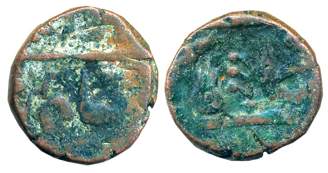 Indore, Copper, 10.45g, in the name of Shah Alam II, Obv: Shivpindi, Rev: Trishul. Very fine+.