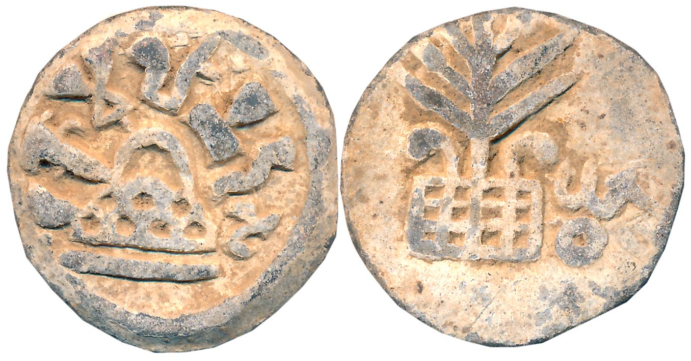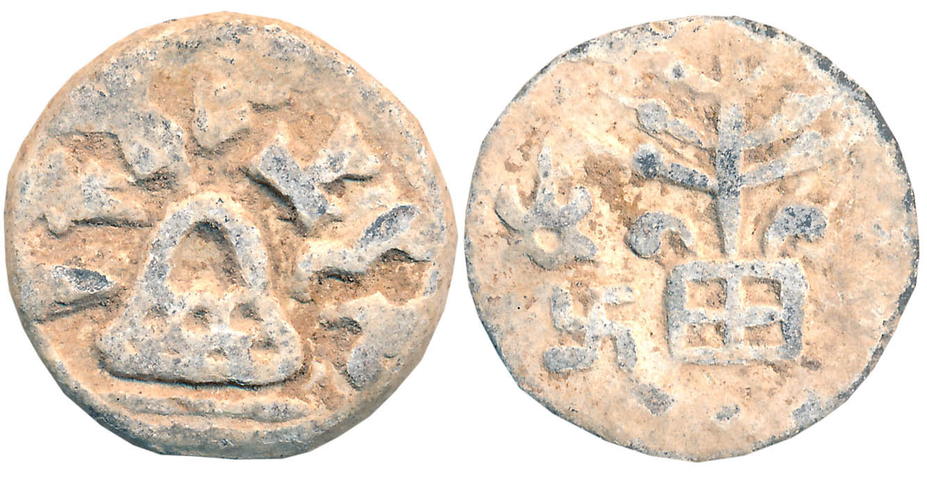 Chutus of Banvasi, Lead, 1.01g, Obv: Nandipada, Rev: 9 Arched hill. Extremely fine.