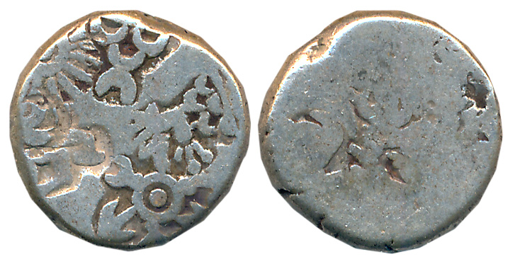 Chutus of Banvasi, Mulanandasa, Lead, 15.14g, Obv: Eight-arched hill with circular Brahmi legend, “Rajno Mulanandasa”, Rev: Tree in railing in four compartments, Srivatsa symbol to right. Extremely fine.