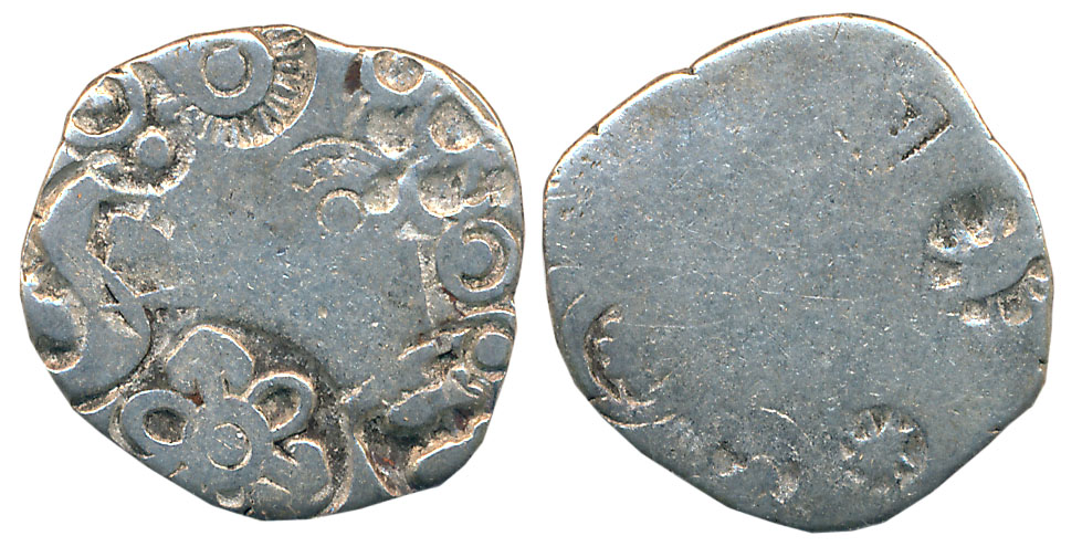 Punch Marked, Attributed to Magadha Janapada, Silver Karshapana, 3.16g, Five symbols type (Rajgor Series 12). Very fine.