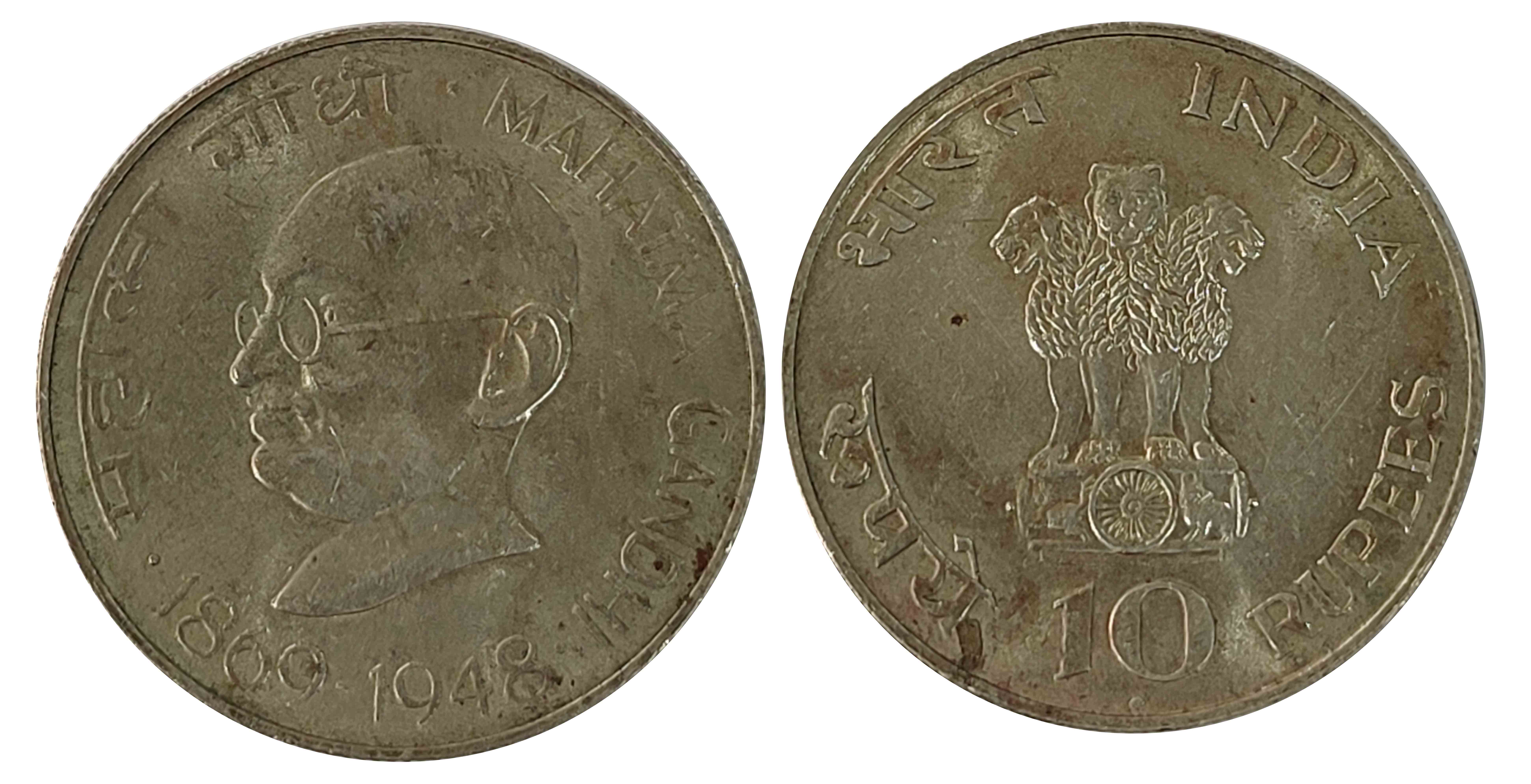 1969, 10 Rupees, Silver, “Centenial-Mahatma Gandhi’s Birth”, Bombay Mint Obv: Ashoka Lion Pedestal, Rev: Portrait of Mahatma Gandhi facing left date below (KM# 185). Uncirculated. You are saving Rs. 100/- on this purchase.