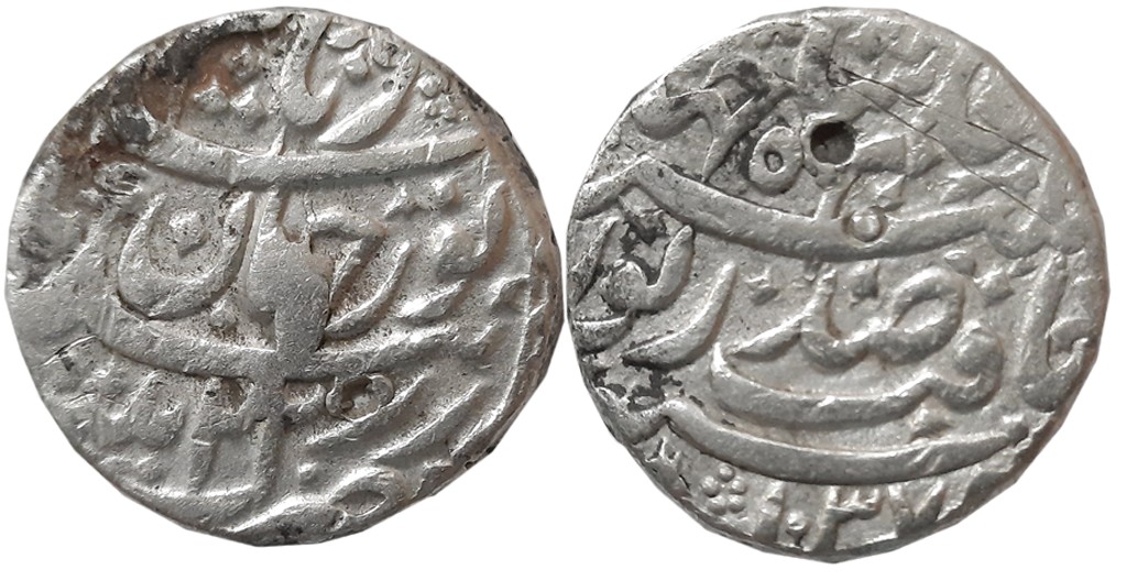 Mulher- Aurangnagar, Silver Rupee, 11.31g, “Sahib-i-qiran” couplet, in the name of Alamgir II, Shivpindi and flower symbol on reverse (M&W# T2b). Very fine.