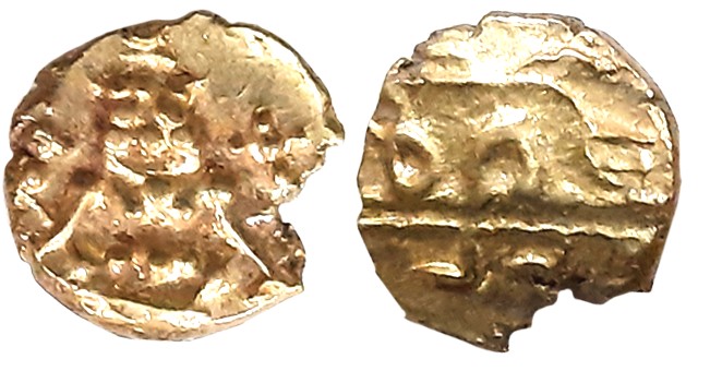Gold Narsimha Fanam, 0.38g, Obv: Lord Narsimha, Rev: Legend (KM# C# 212). Very fine+ to extremely fine.
