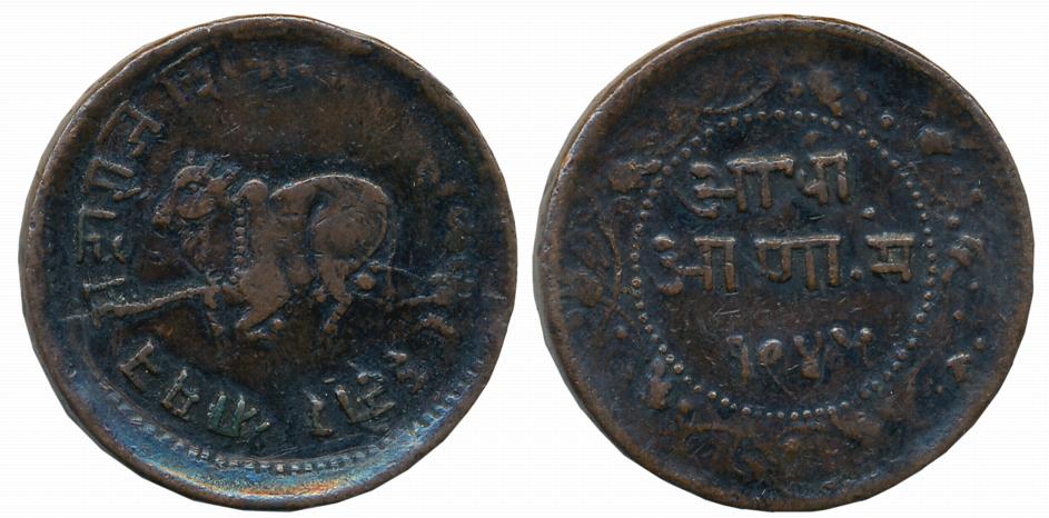 Token, Ram Tanka Temple Token, Silver, 12.51g, Obv: Ram Seeta seated on thorn, facing Hanumanji, attending holding chattra, Rev: Lord Hanuman flying towards Sun. About very fine.